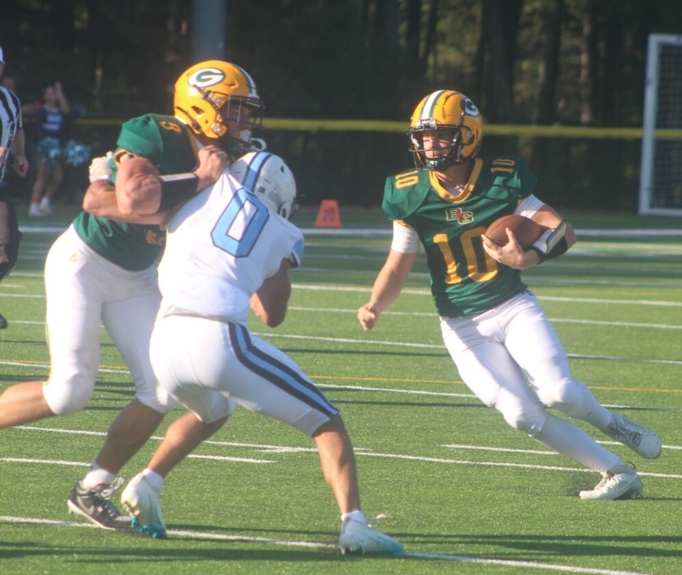 Bishop Guertin’s Nate Bowen tries to get around Nashua North’s Jedwin Lluveres (0) with a block from Jonah Feliciano during their regular season meeting at Stellos Stadum. They’ll meet again on Saturday. (Telegraph file photo by TOM KING)